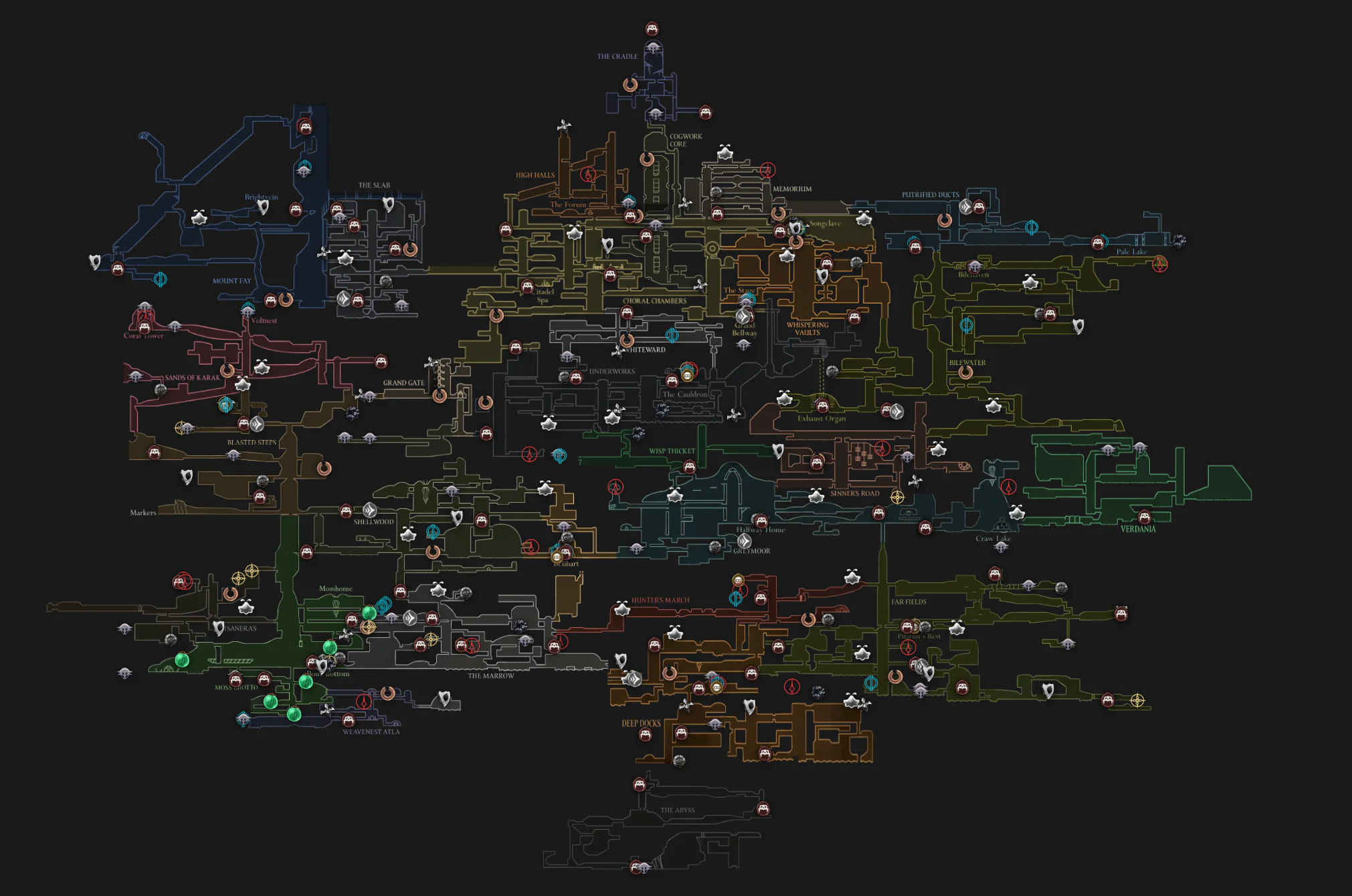 - The Marrow β Connects Moss Grotto to Deep Docks; features early boss encounters and Shakra's first appearance